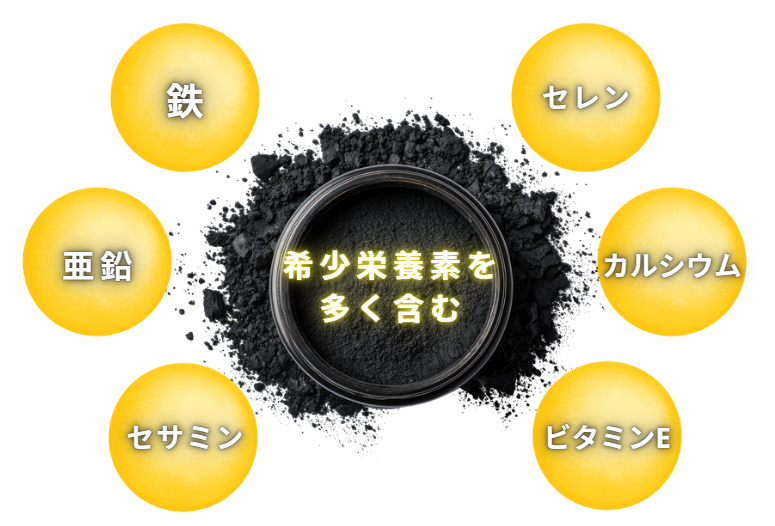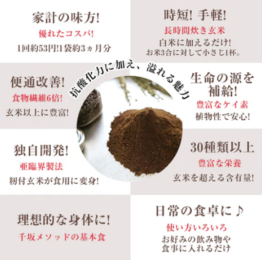 籾付玄米には、玄米の6~7倍もの食物繊維および人体の主要な器官の形成に欠かせないケイ素が含まれているほか、ビタミンEを始めとする複数の抗酸化物質が含まれていますが、固い籾は通常の炊き方での食用は不可能です。これを独自製法によって籾付玄米を黒焼き状態に炊きあげ、それを身体にとって最適な栄養状態で消化・吸収できるようにパウダー状に加工しています。